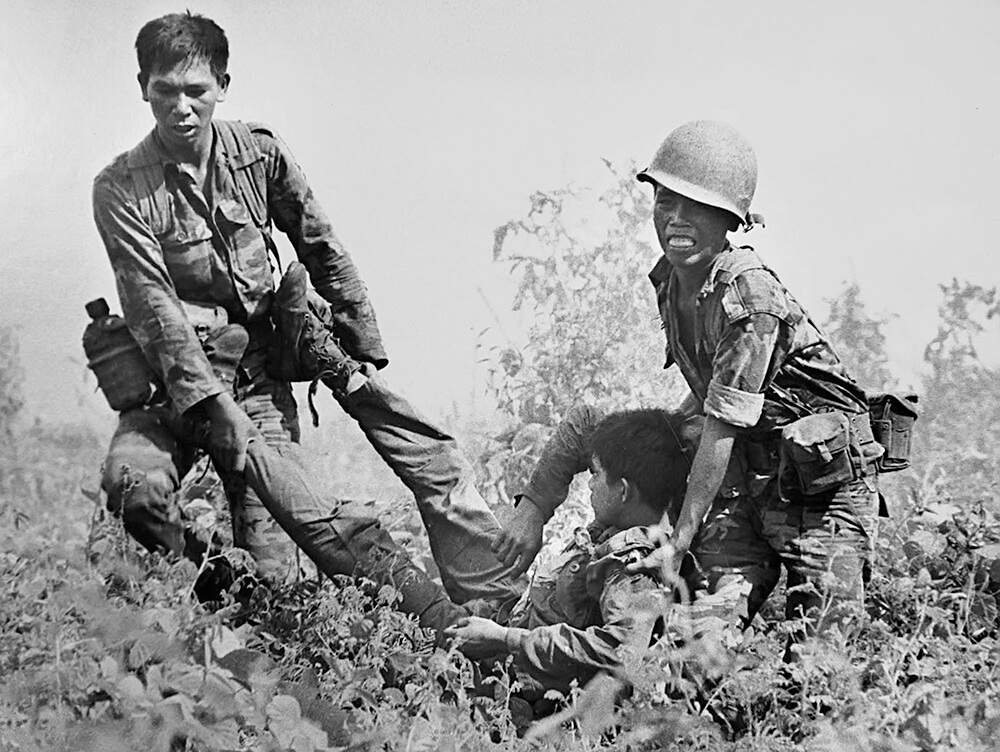 David Hume Kennerly, Vietnamese Soldiers Carrying Wounded Soldier from Battle Field near Tay Ninh, South Vietnam, 1971. © Bettmann/Getty Images