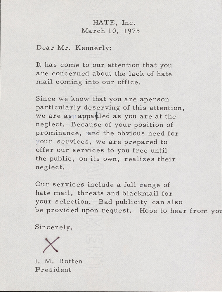 Letter to David Hume Kennerly jokingly signed I.M. Rotten, March 10, 1975
