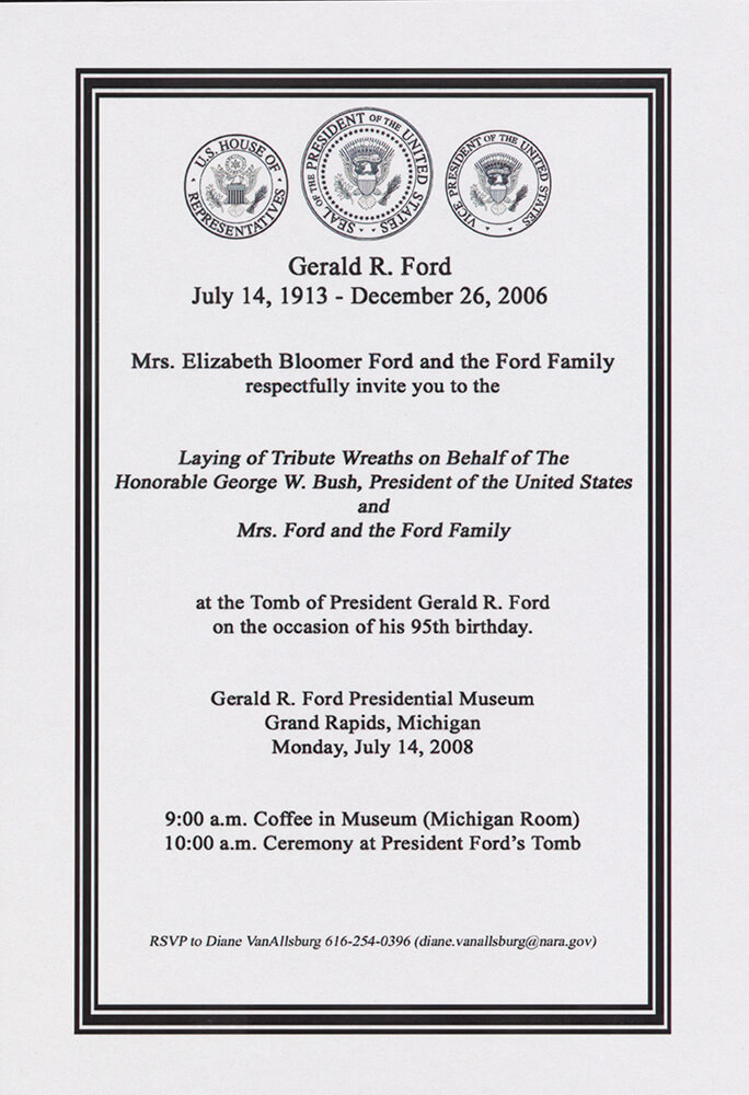 An invitation to the Laying of Tribute Wreaths on behalf of President George Bush at the Gerald R. Ford Presidential Museum, Grand Rapids, Michigan, 2008