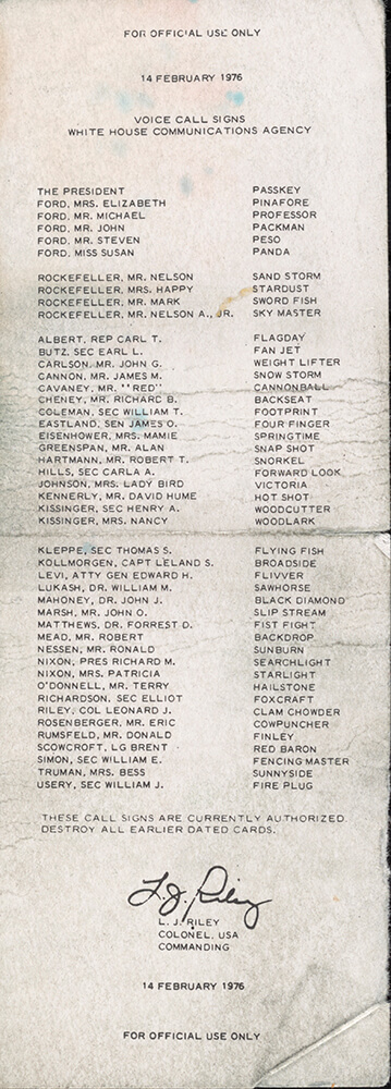 White House Communications Agency voice call signs, February, 1976 (image 1 of 2)