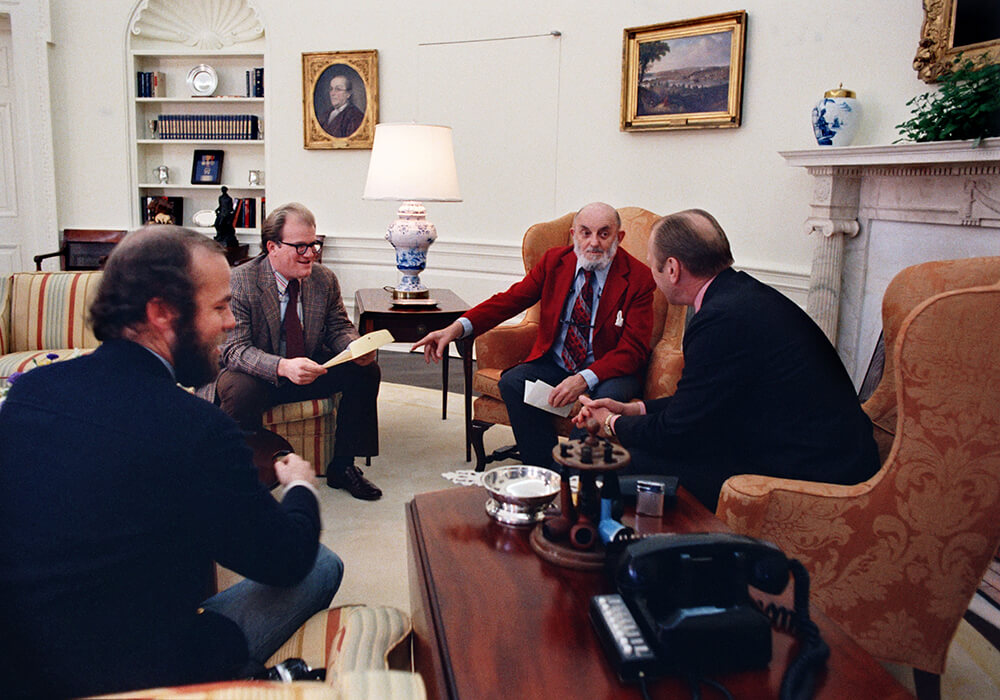 Ricardo Thomas, Gerald R. Ford, President; Ansel Adams, Photographer; Bill Turnage, Director of The Wilderness Society; And David Hume Kennerly, Photographer, Meeting in White House Oval Office, Washington, D.C., 1975