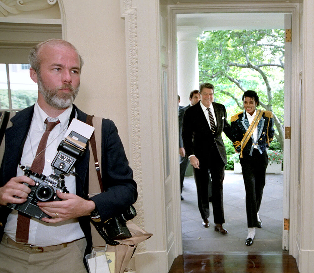 Mike Evans, David Hume Kennerly, Photographer; Ronald Reagan, President; And Michael Jackson, Musician, White House, Washington, D.C., 1982